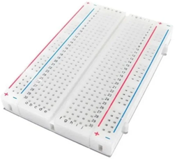 04) Protoboard: A Protoboard ou Breadboard é uma placa com furos (ou orifícios), utilizada para construção de circuitos temporários. A mesma possibilita que o usuário insira e remova fios e componentes de forma rápida e prática sem a necessidade de solda, tornando possível a alteração do esquema do projeto a qualquer momento.